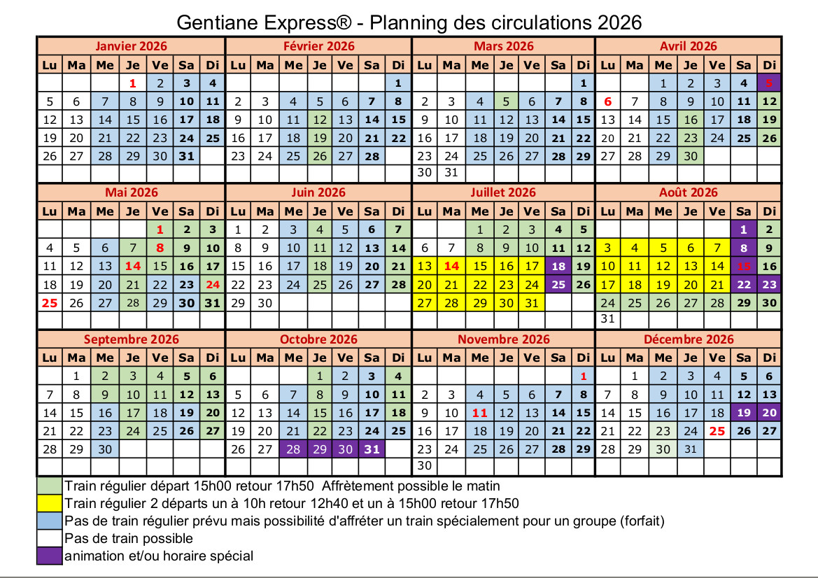 Jours et heures de circulation indiqués sur le calendrier de circulation 2026.
