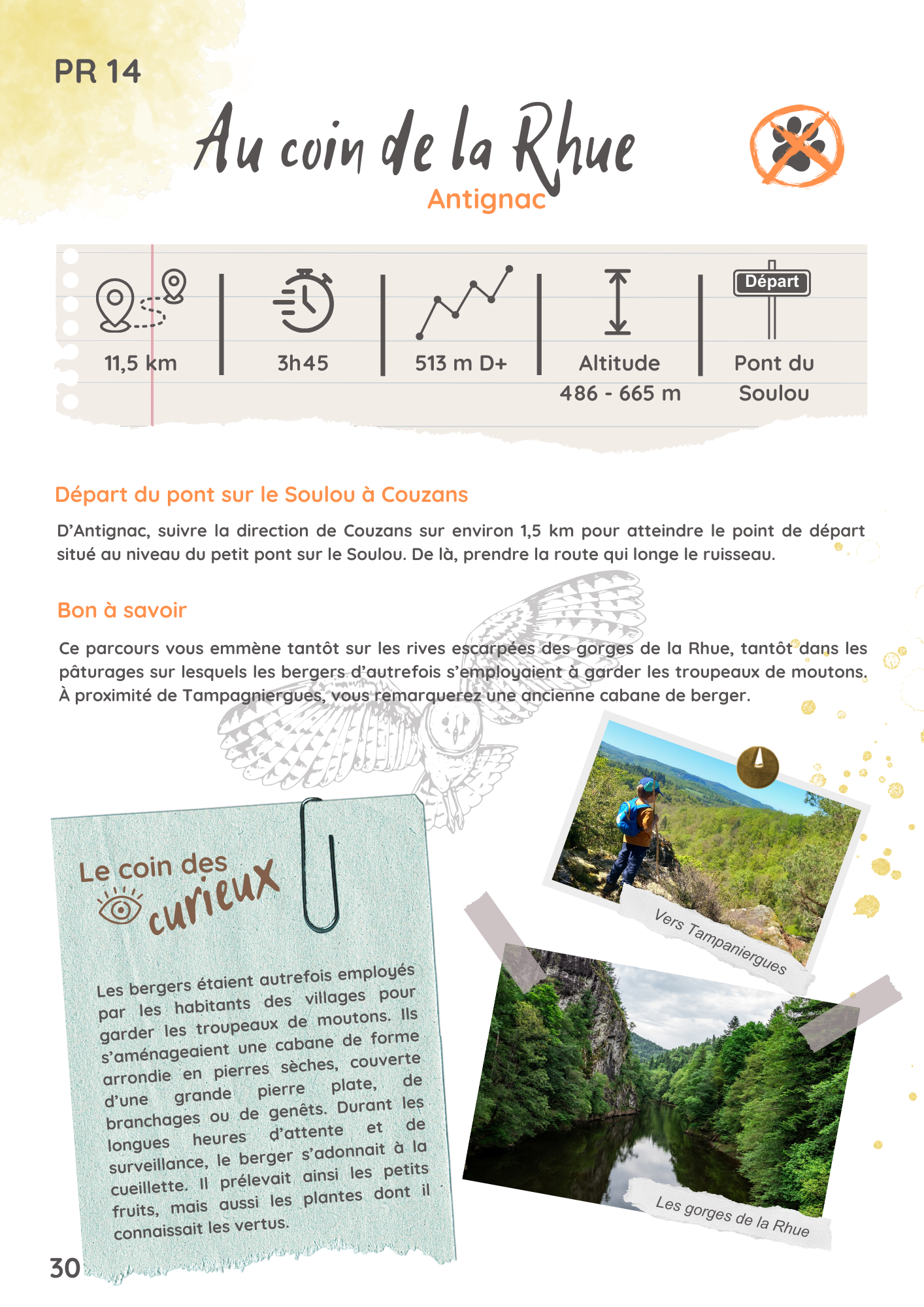 Lieu de départ : Pont sur le Soulou à Couzans. D’Antignac, suivre la direction de Couzans sur environ 1,5 km pour atteindre le point de départ situé au niveau du petit pont sur le Soulou. De là, prendre la route qui longe le ruisseau